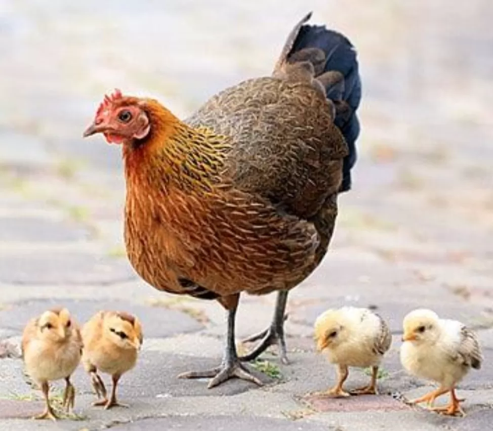 induk ayam kampung berwarna cokelat keemasan dengan bulu bagian leher yang tampak lebih terang dan mengilap. Ia sedang berdiri di atas jalan berbatu, dikelilingi oleh empat ekor anak ayam kecil berwarna kuning dan cokelat muda. Anak-anak ayam itu tampak mengikuti induknya dengan posisi berdekatan, menggambarkan momen alami yang hangat dan penuh kasih antara induk ayam dan anak-anaknya. Suasana gambar terasa alami dan lembut, menggambarkan kehidupan pedesaan yang sederhana namun harmonis.